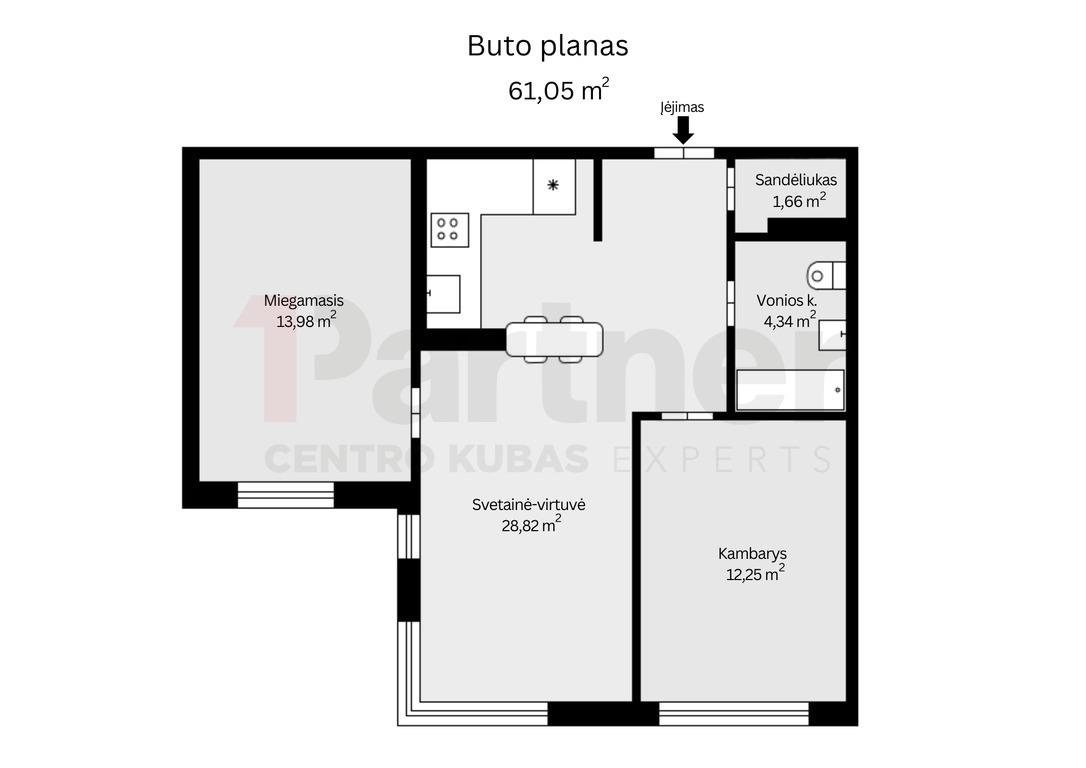 • Funkcionalus ir patogus buto išplanavimas – du miegamieji kambariai priešingose pusėse, svetainė nuo virtuvės zonos atskirta baru, vonios kambarys bei koridorius.