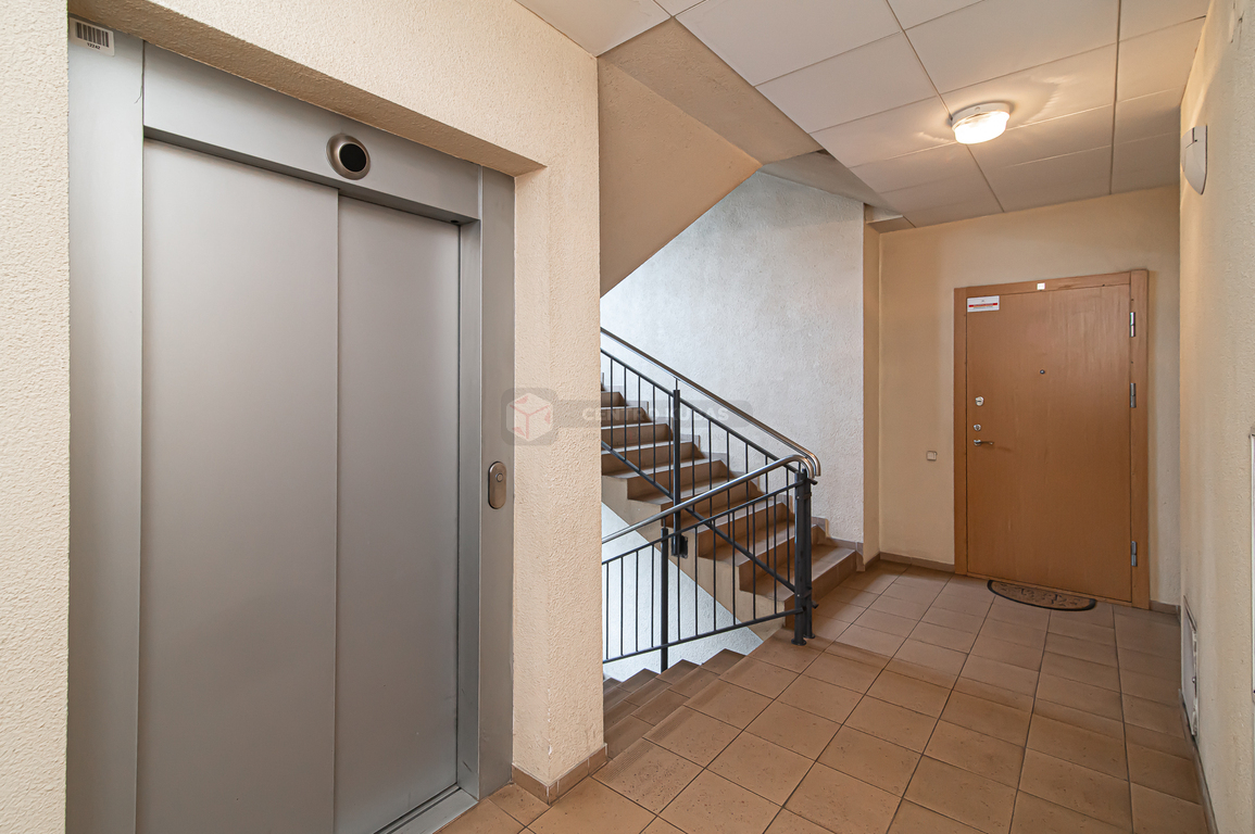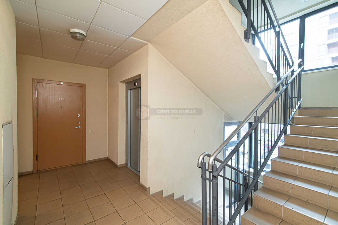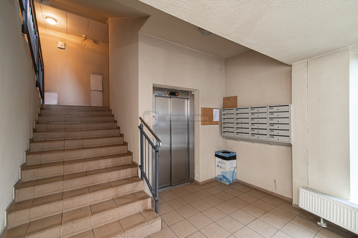 Įėjimo durys su kodine spyna, laiptinė tvarkinga, kaimynai draugiški.