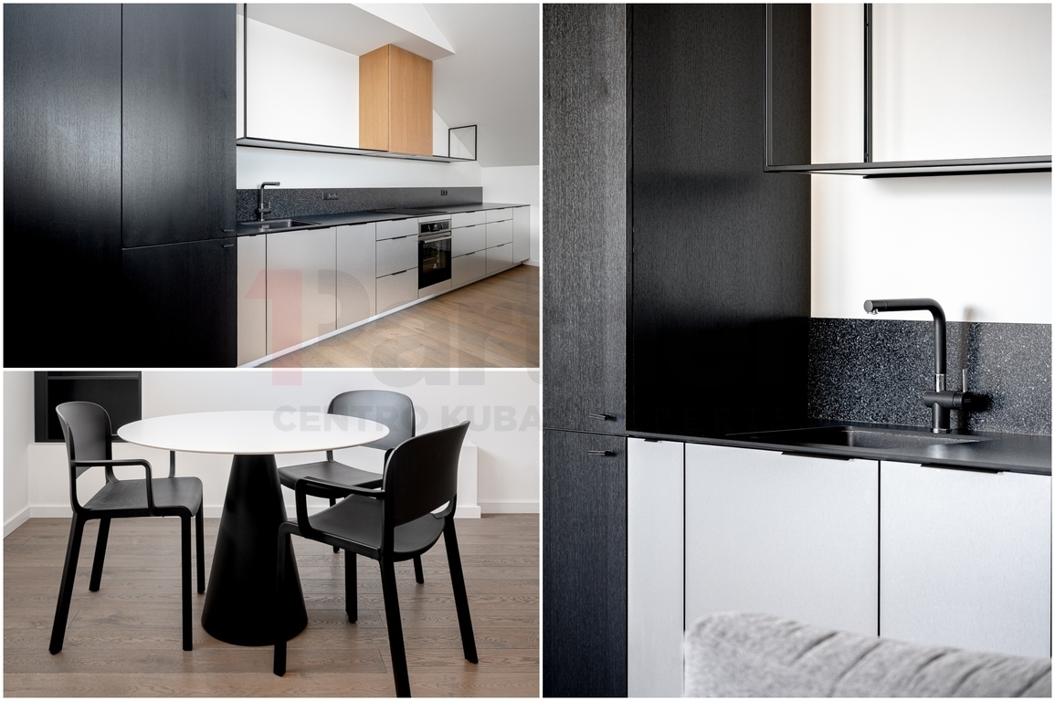 • Integruoti virtuvės baldai (yra įmontuota indaplovė, indukcinė kaitlentė, gartraukis, orkaitė, šaldytuvas).