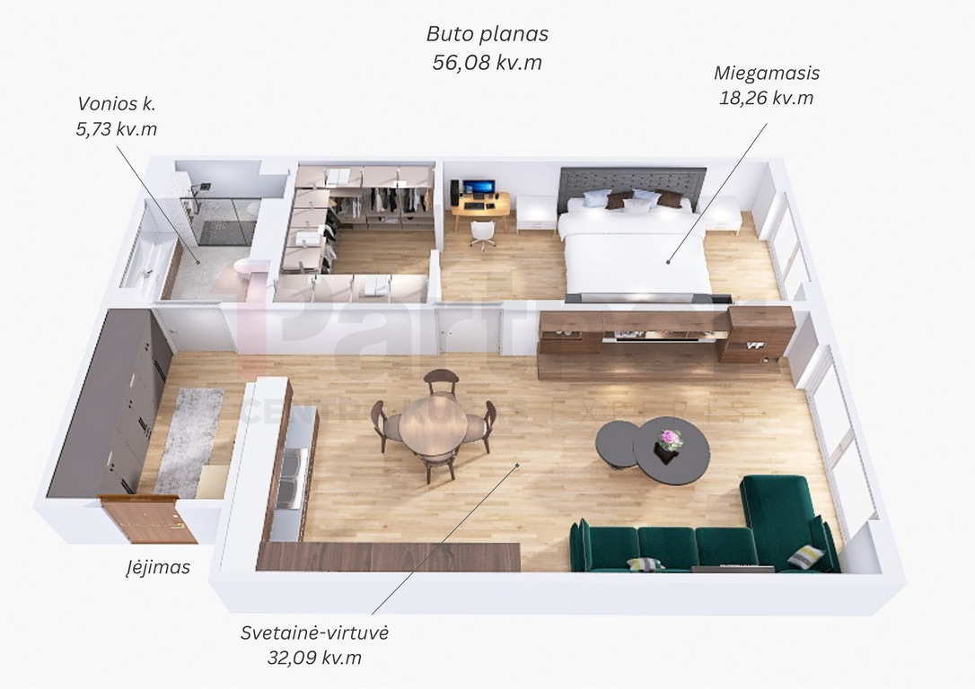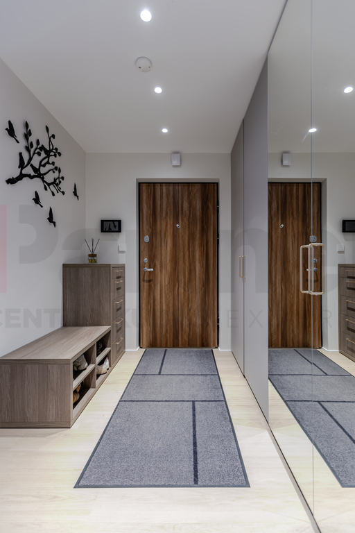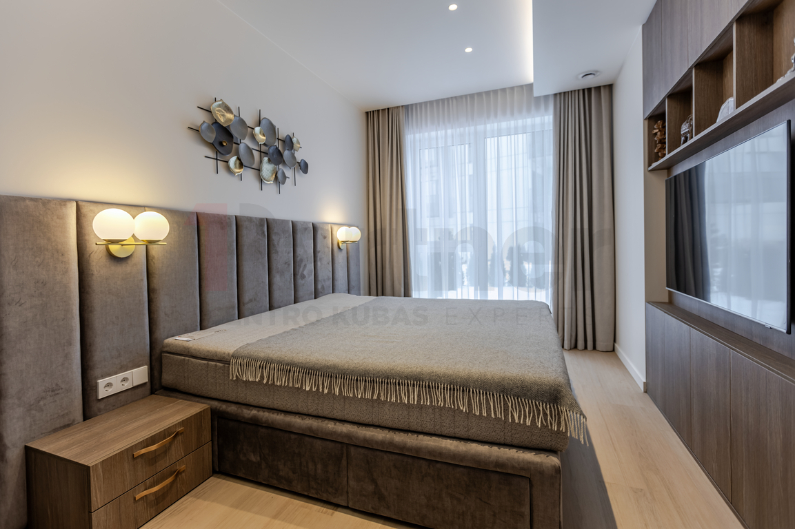• Bendra svetainės, valgomojo ir virtuvės erdvė, miegamasis su erdvia įeinama drabužine, vonios kambaryje erdvus dušas, yra atskira spinta daiktų susidėjimui, koridoriuje didelės sieninės spintos patogiam daiktų ir rūbų laikymui.