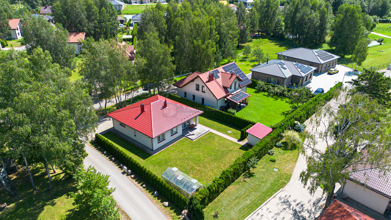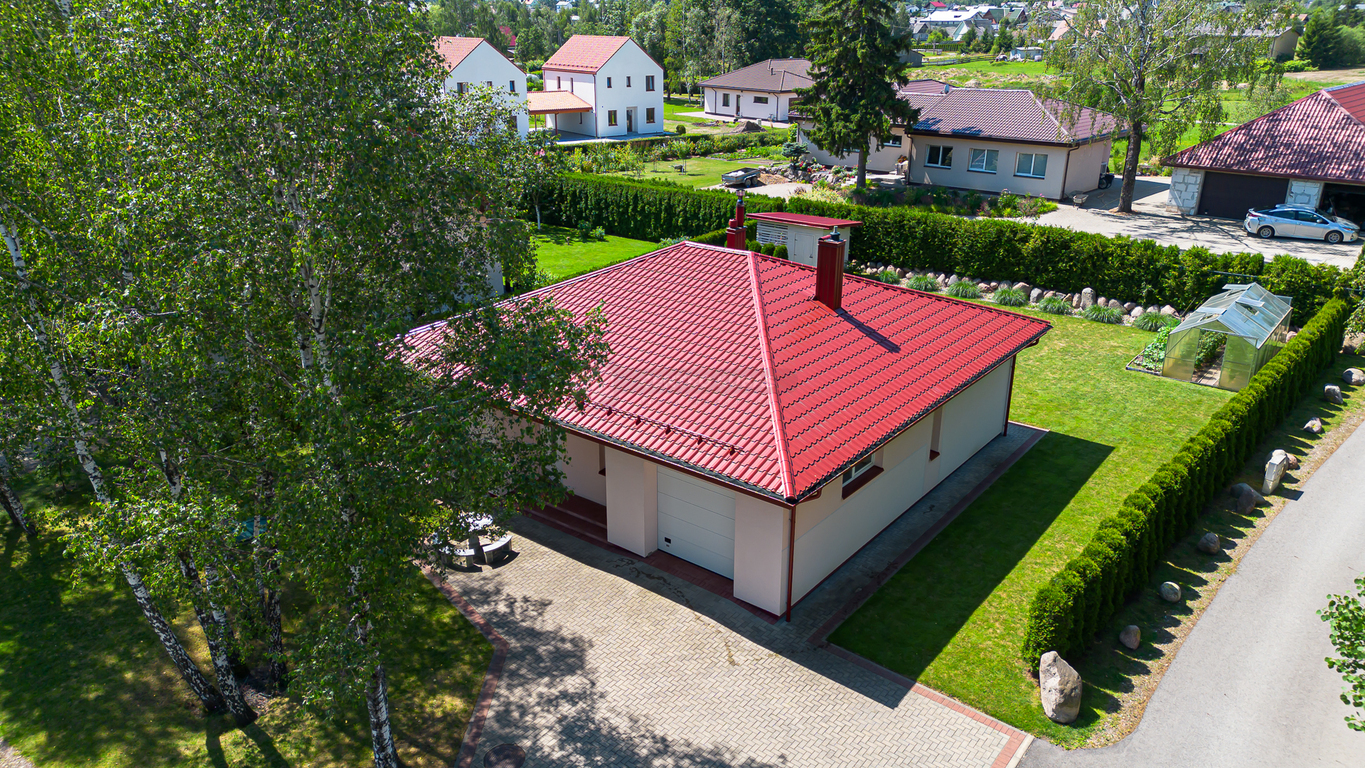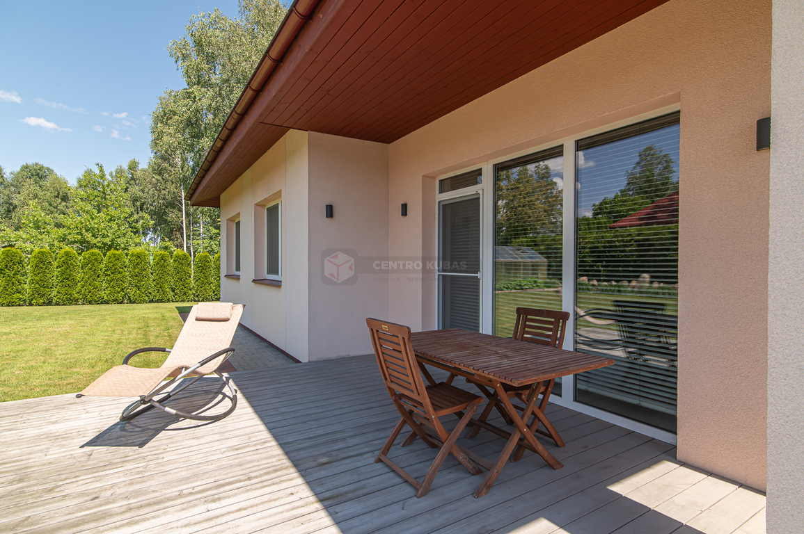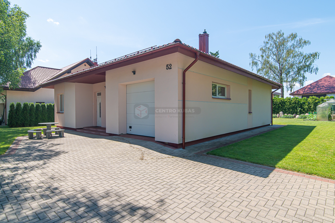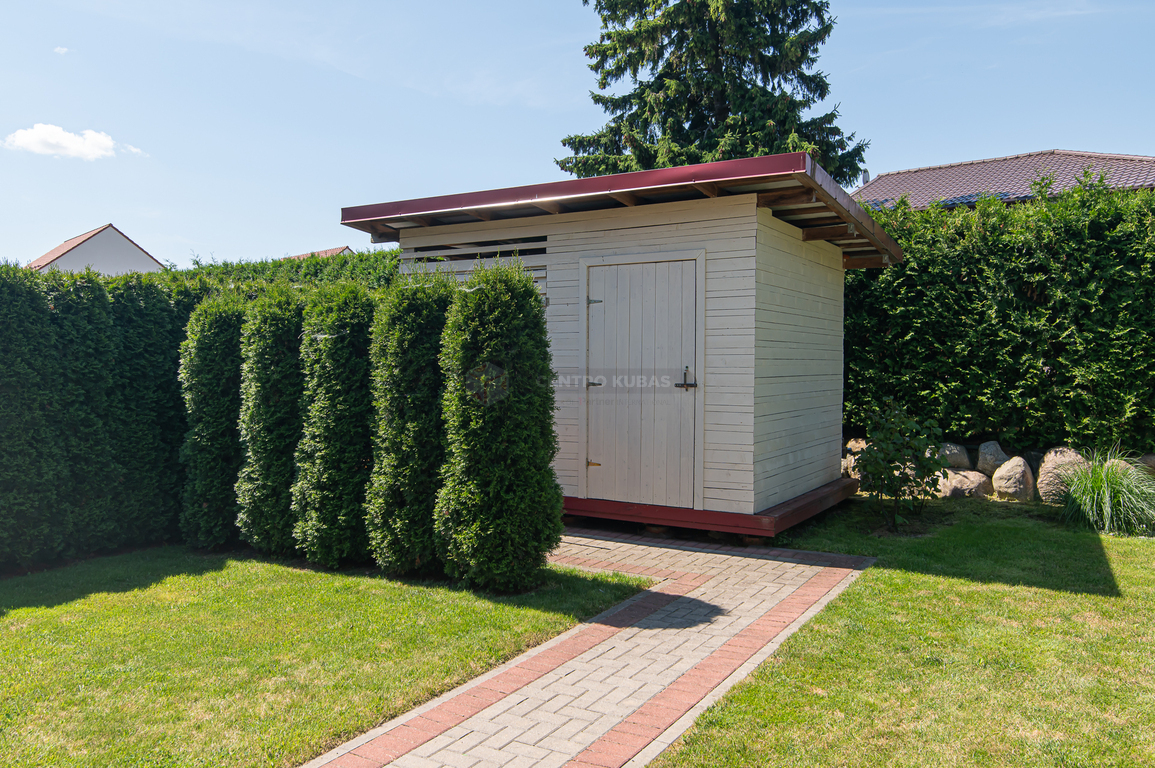 10.87 arų sklype puikiai sutvarkyta ir išpuoselėta aplinka. Sklypas apsėtas veja, įrengta automatinė vejos laistymo sistema. Yra šiltnamis bei lauko sandėliukas daiktams susidėti. Įvažiavimas į garažą, takas aplink namą ir takas iki lauko sandėliuko išklotas trinkelėmis. Prie įėjimo į namą padaryti ilgaamžiai betoniniai suoliukai bei stalas jaukiems bei patogiems pasisėdėjimams visais metų laikais. Medinių lentų terasa orientuota į vidinį kiemą. Teritorija apsodinta tujomis, kurios garantuoja privatumą. Patogus asfaltuotas privažiavimas iki pat namo.